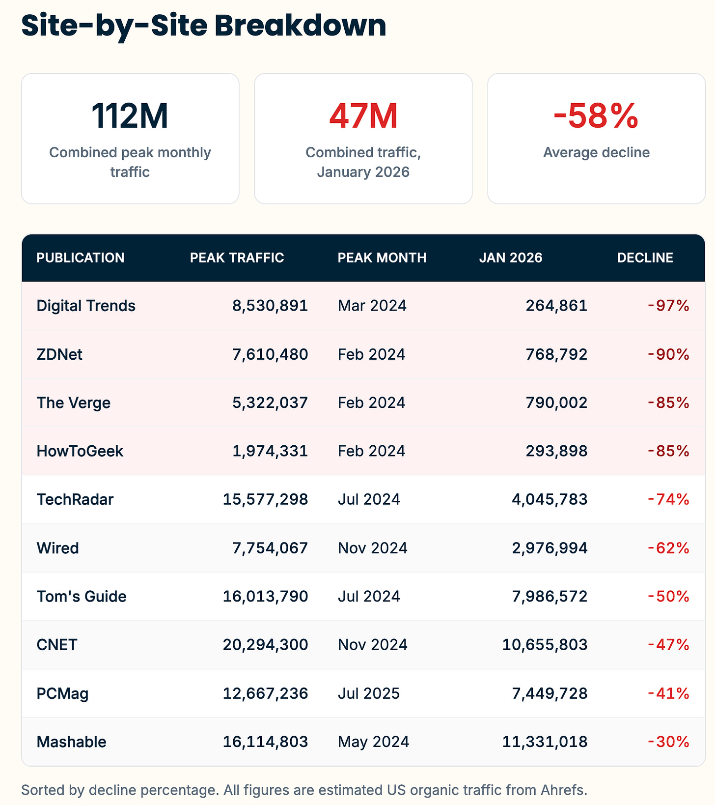 テックメディアがGoogle検索から消えている:CNETやWIREDなど米国の主要テクノロジーメディア10社は、24年2月からの2年間でGoogleからの月間オーガニック訪問を6,500万回(全体の約6割)分失った。テック系だけではなく金融系のNerdWaleetは▲73%、健康系のHealthlineも▲50%である。Growtikaの分析によれば、この減少はGoogleによるAI概要機能によるものだという。メディアが書いた記事をGoogleが自動で吸い上げ、検索画面最上部でユーザーに直接答える。この構造が続く限り、テックメディアの衰退は加速するだろう。 >記事を読む